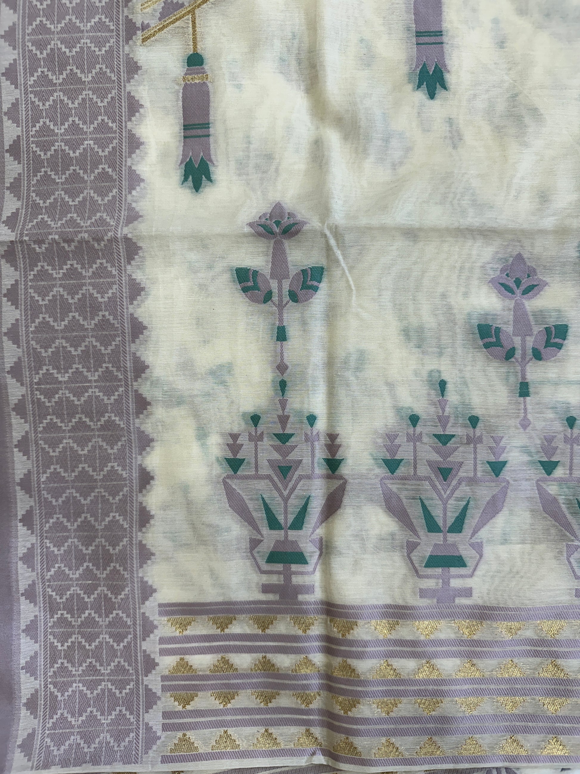 White Banarasi Cotton Suit Set with Green and Purple Booti